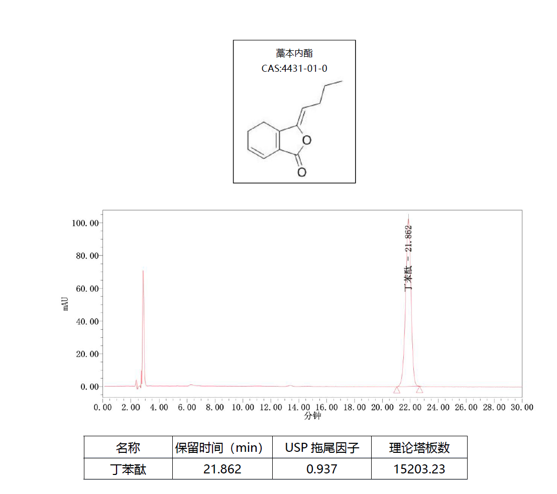 App ID: FLM-T250008 Titank C18-Plus 對(duì)川芎中藁本內(nèi)酯含量測(cè)定 方法:中國藥典2025 一部 色譜柱:Titank C18-plus 5μ 250×4.6mm (貨號(hào):FMG-0060-EONU) 流動(dòng)相:甲醇:水=52 : 48 流速:1mL/min 檢測(cè):丁苯酞UV 230nm 藁本內(nèi)酯UV 330nm 溫度:35℃ 樣品濃度:8mg/mL(藥典規(guī)定) 進(jìn)樣量:10uL 標(biāo)準(zhǔn)品色譜圖:丁苯酞230nm
