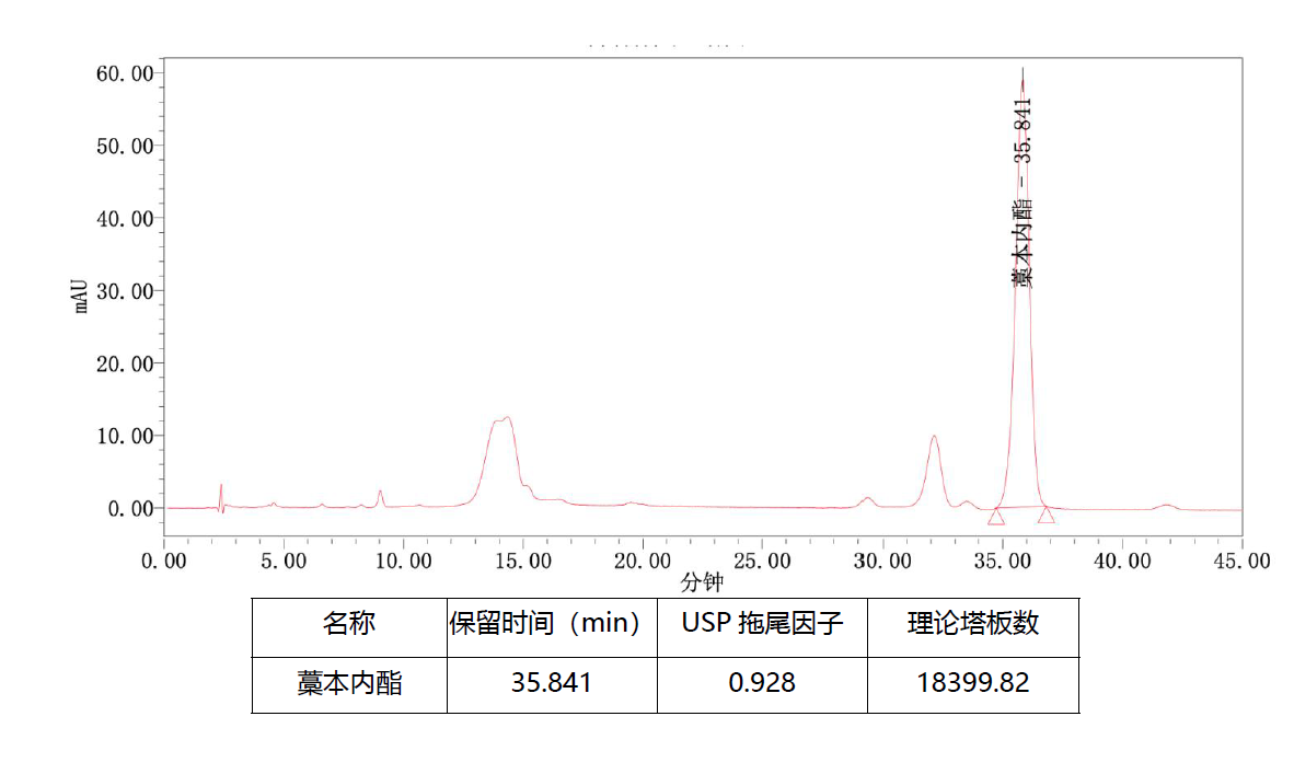 評(píng)價(jià):藥典要求丁苯酞峰理論塔板數(shù)高于3000,藁本內(nèi)酯色譜峰與丁苯酞色譜峰相對(duì)保留時(shí)間1.67 ± 5% ( 34.69min-38.34min ) , 以上要求非常挑柱。經(jīng)多柱篩選, 采用Titank C18-Plus 5u 250*4.6mm 色譜柱,藁本內(nèi)酯出峰35.84,符合要求,且理論塔板數(shù)遠(yuǎn)高于藥典要求。 |
